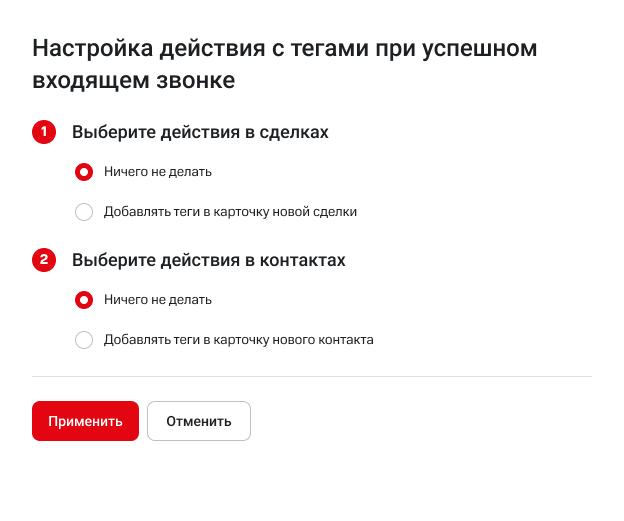 2. В открывшемся окне выберите, что делать при успешном входящем звонке: добавлять теги в сделки или контакты или не добавлять.