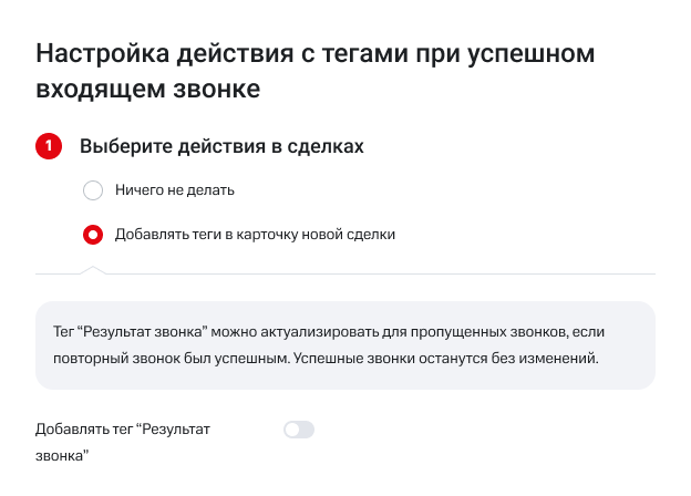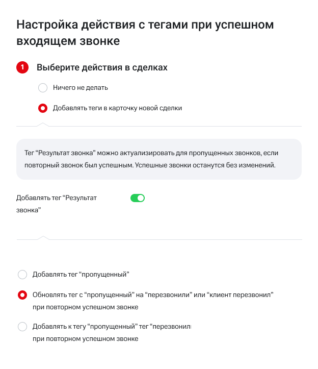 Правила добавления тегов при непринятых вызовах настраиваются также, как и при успешных, но также дополнительно для непринятых звонков можно включить тег «Результат звонка», который будет автоматически обновляться при повторном успешном дозвоне до того же клиента.