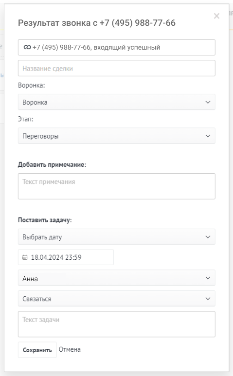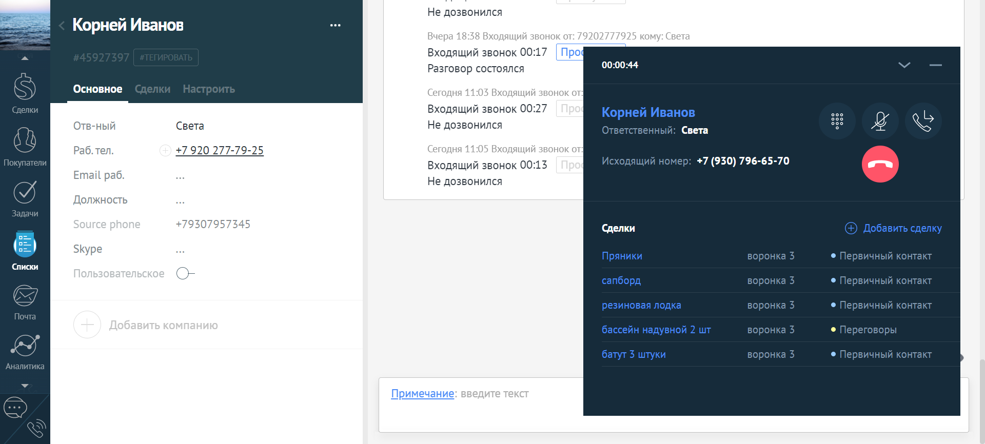 • создать новую сделку по результатам звонка (она будет связана с выбранным контактом),