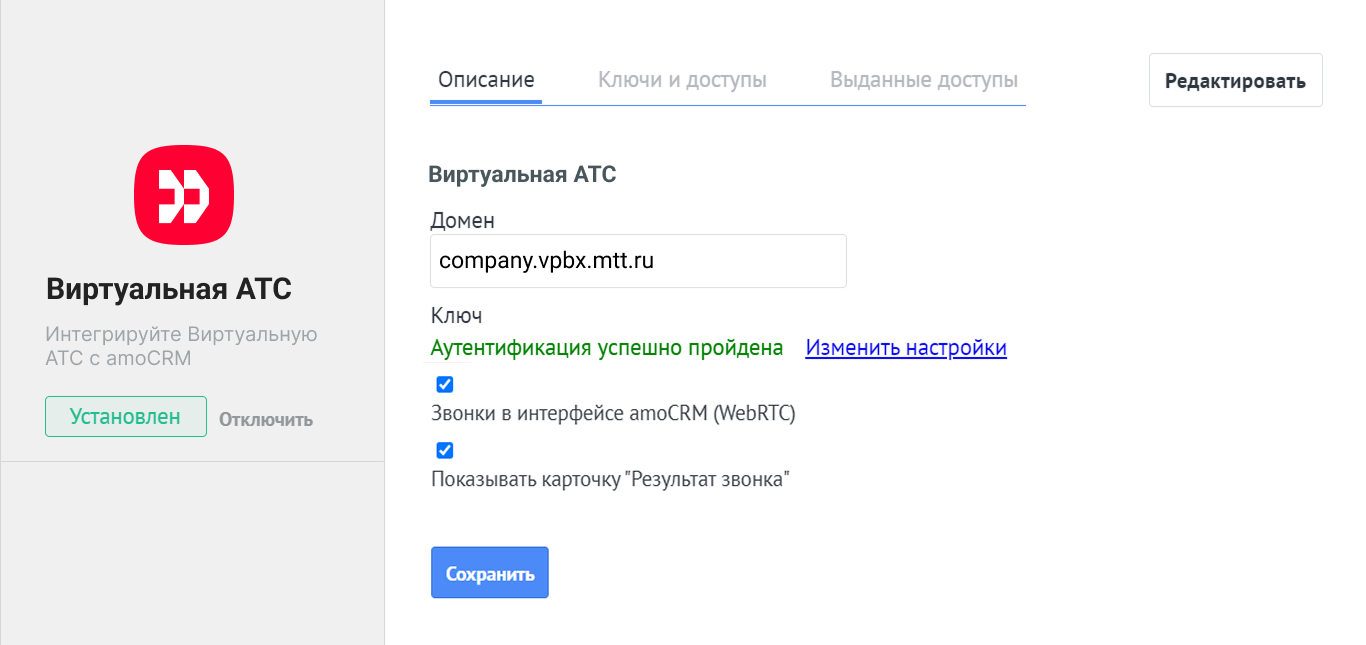 В amoCRM зайдите в раздел «Настройки» — «Интеграции» — «Виртуальная АТС», выберите «Звонки в интерфейсе amoCRM (WebRTC)» и «Показывать карточку «Результат звонка»».