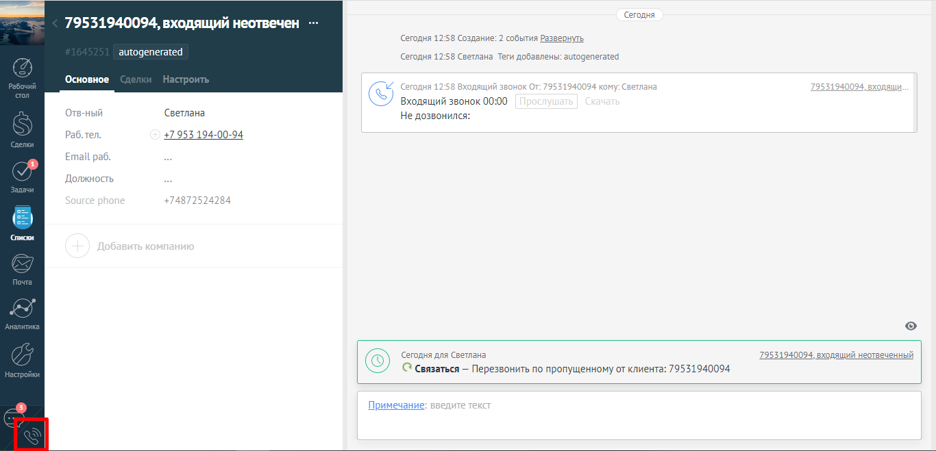 1. Работа с входящими звонками в интерфейсе amoCRM