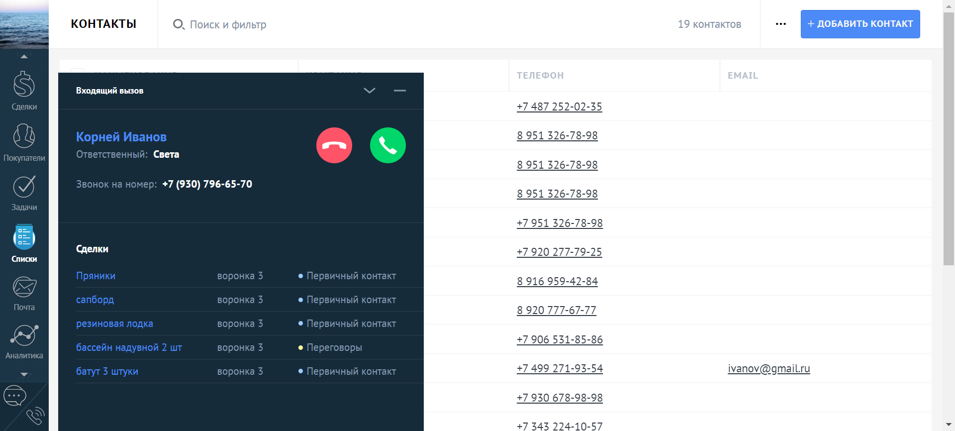 При поступлении входящего звонка вы не только увидите всплывающую карточку с доступной информацией о клиенте, но и сможете принять звонок, кликнув на зеленую трубку виджета.