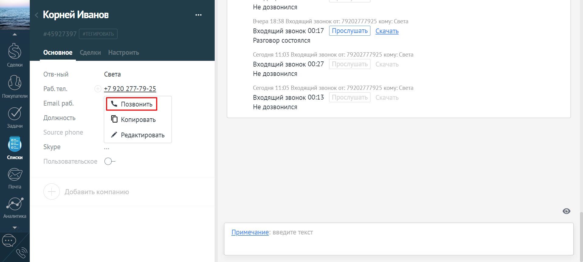 • Звонок ранее сохраненному контакту: кликните по номеру телефона в карточке клиента или в разделе «Список контактов». Клик по номеру телефона позволит не только копировать и редактировать номер, но и звонить контакту прямо из amoCRM.