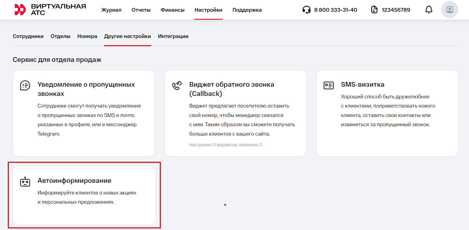 2. В разделе «Сервис для отдела продаж» выберите «Автоинформирование».