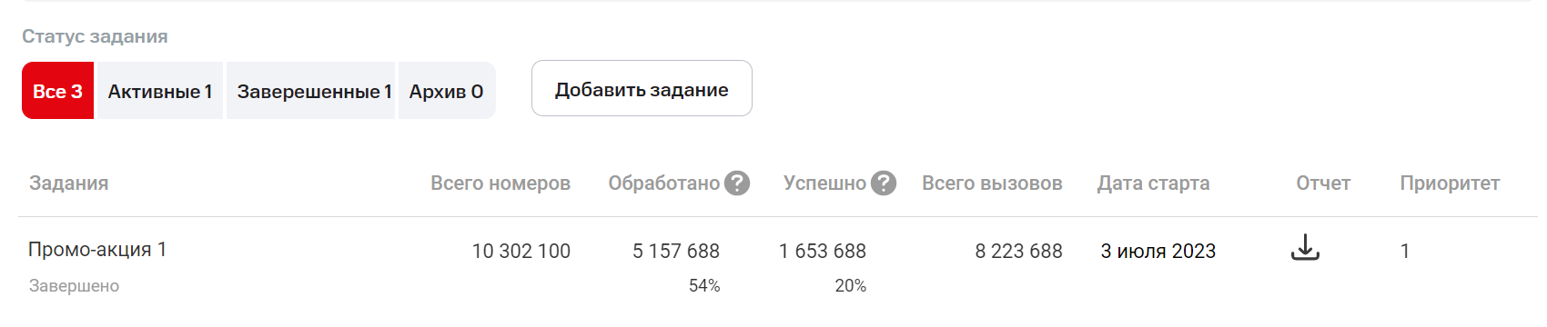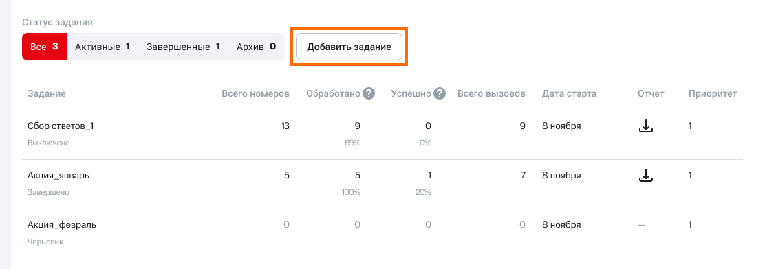Приоритет будет влиять на то, как распределятся звонки между заданиями: Виртуальная АТС сделает больше звонков с приоритетом 1 и меньше – с приоритетом 5.