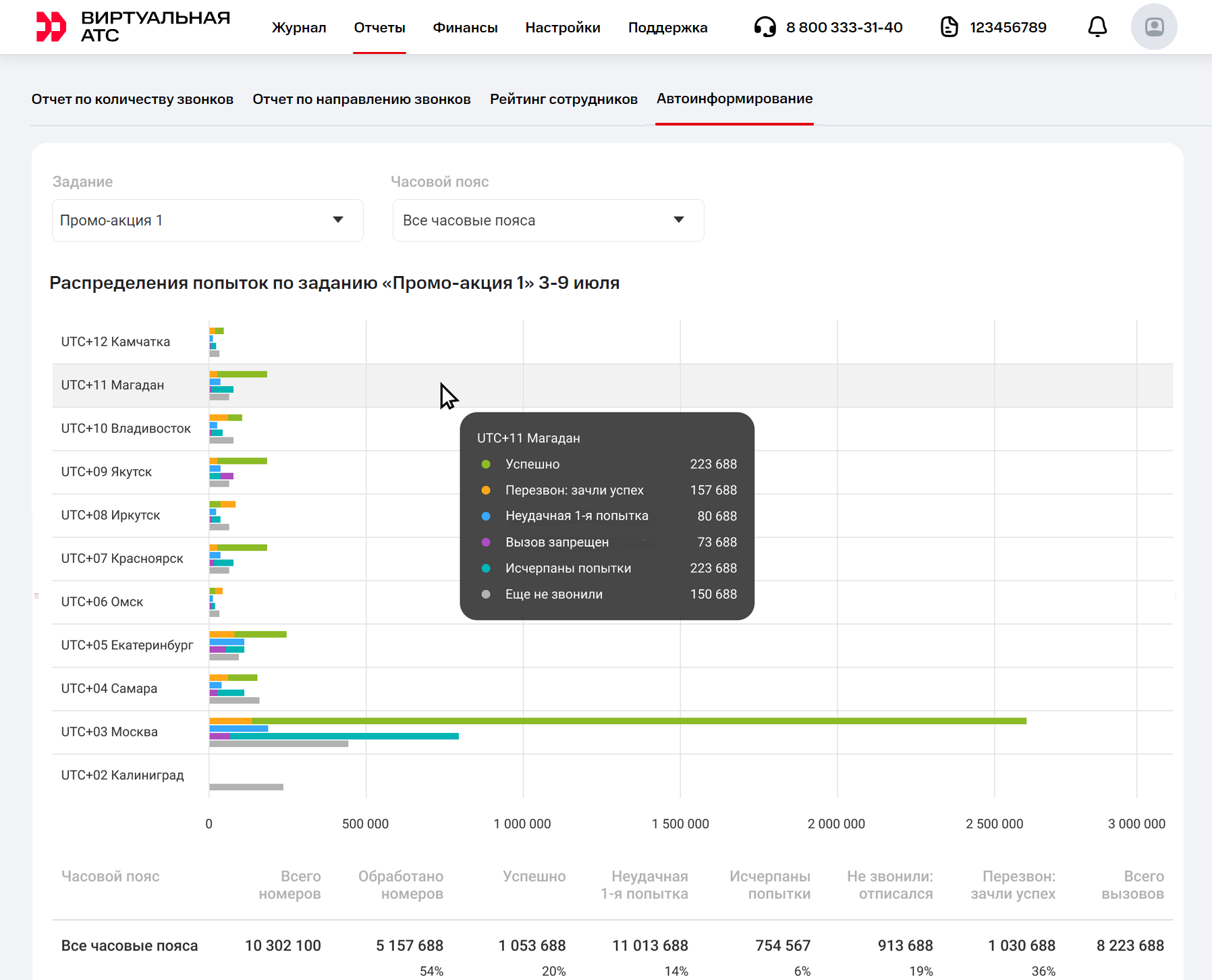Автоинформирование начнется в указанное вами время, учитывая часовой пояс клиентов, который Виртуальная АТС определит по номеру телефона. Если Виртуальная АТС не сможет определить часовой пояс, автоинформирование по этому номеру осуществляться не будет.Как скачать отчет по автоинформированию