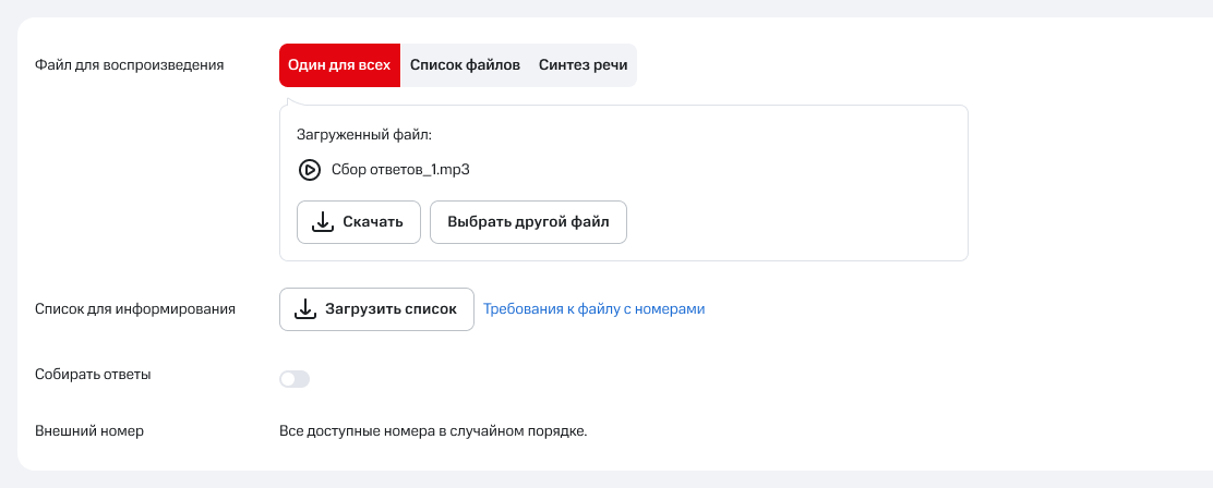 Если вы хотите использовать разные аудиофайлы для разных клиентов, загрузите архив с необходимыми аудиофайлами и файлом формата .csv, .xls или .xlsx. Укажите в архиве, какой файл нужно проиграть для каждого конкретного номера, при этом: