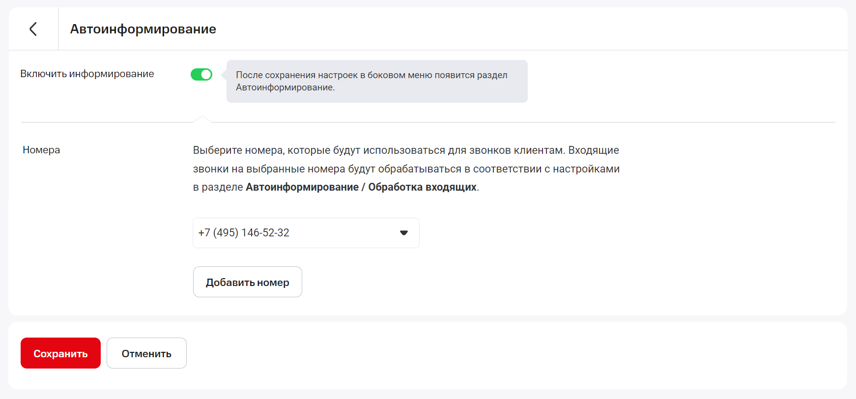 Как было сказано ранее, номера, которые вы выберите для автоинформирования, больше не будут использоваться как общие номера компании.