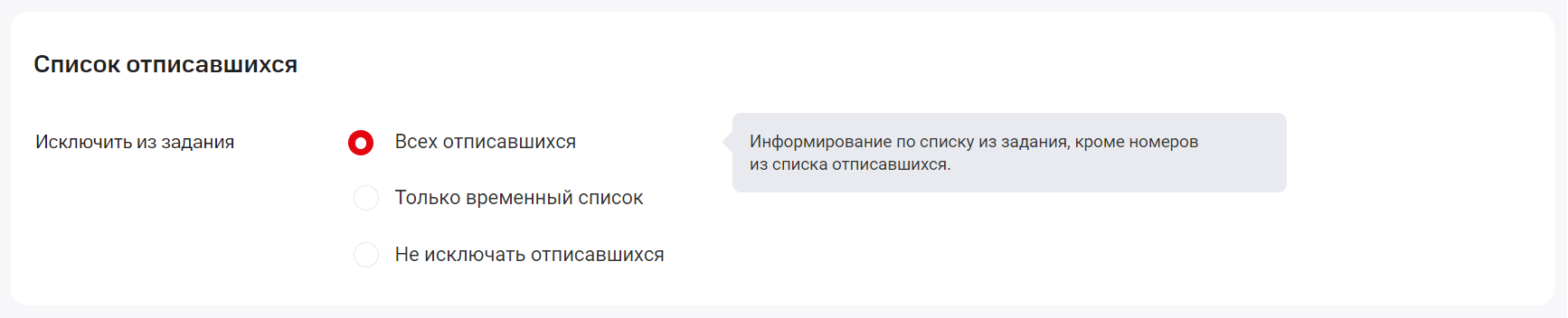 13. Если вы хотите, чтобы Виртуальная АТС не звонила некоторым клиентам из загруженного вами списка для автоинформирования, добавьте исключения. Вы можете настроить, как учитывать в задании список отписавшихся номеров. По умолчанию из задания исключаются все клиенты, добавленные в список отписавшихся. Если вам нужно исключить номера клиентов только из временного списка или оповестить всех клиентов – выберите соответствующую опцию.
