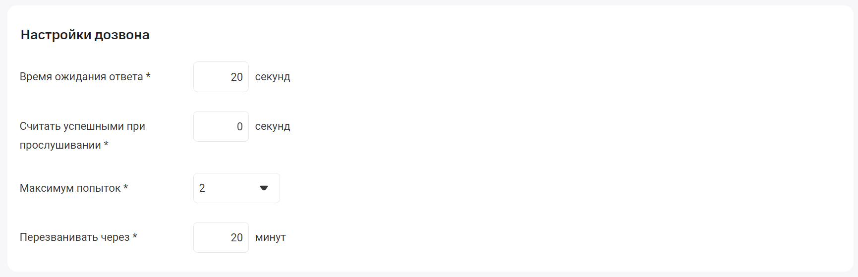 14. Укажите, как Виртуальная АТС будет дозваниваться до клиента: сколько секунд будет ожидать ответа, сколько сделает попыток дозвониться, через сколько минут позвонит повторно. Задайте время прослушивания, по истечении которого звонок будет считаться успешным. Если клиент положит трубку раньше, вызов не будет считаться успешным, и Виртуальная АТС попробует дозвониться еще раз через заданный интервал времени.