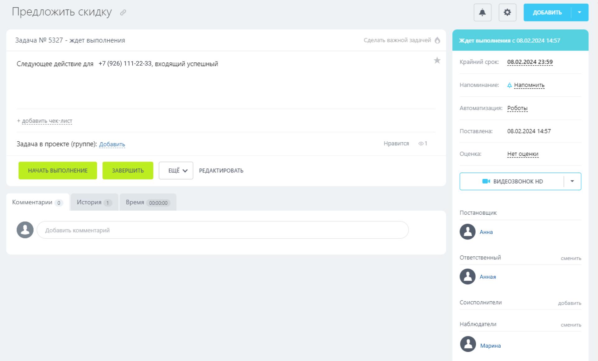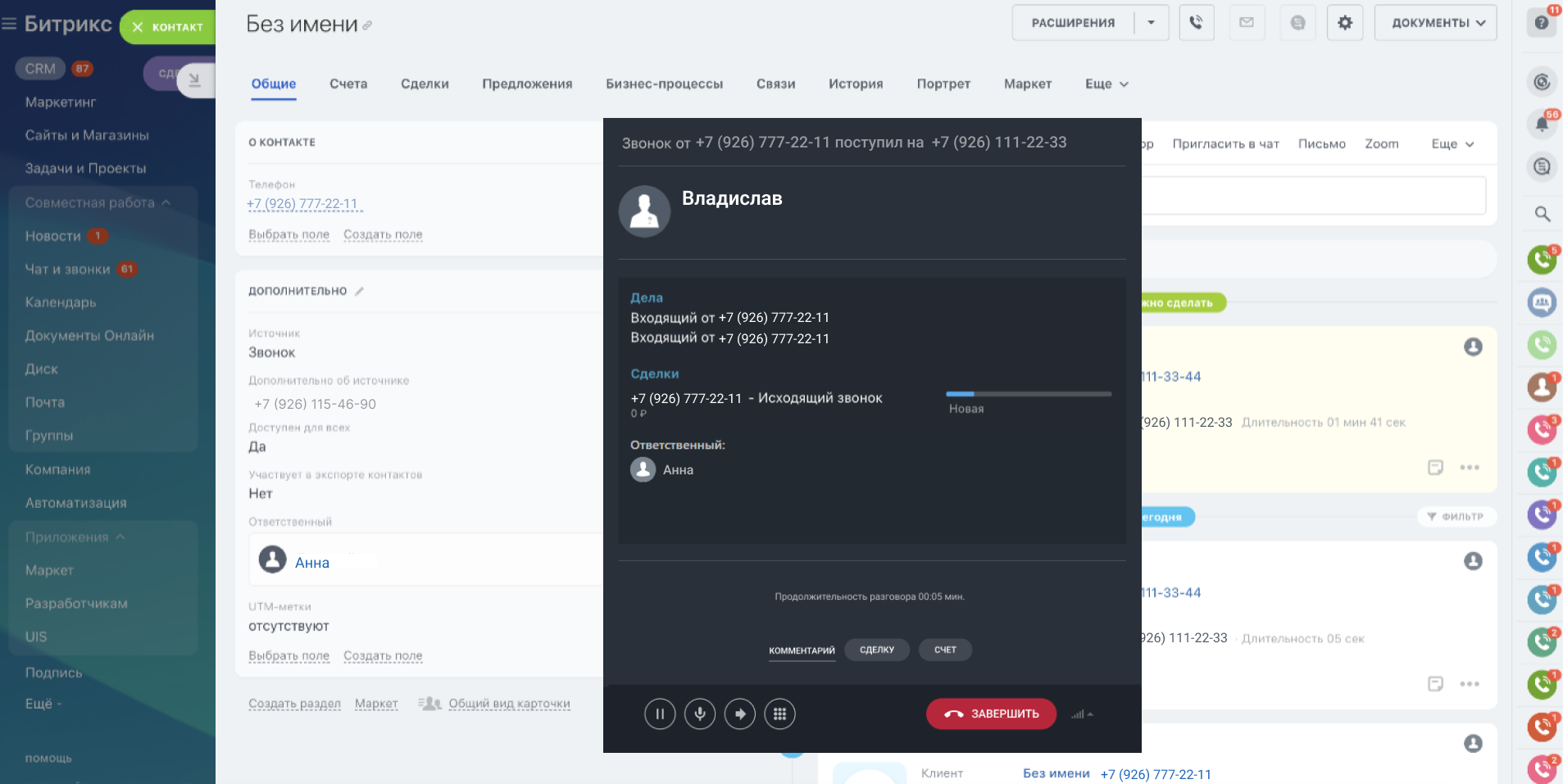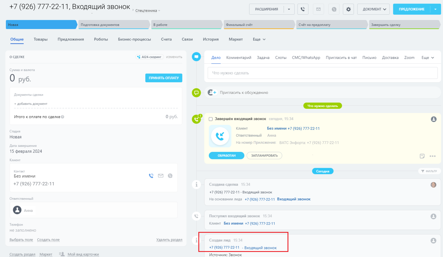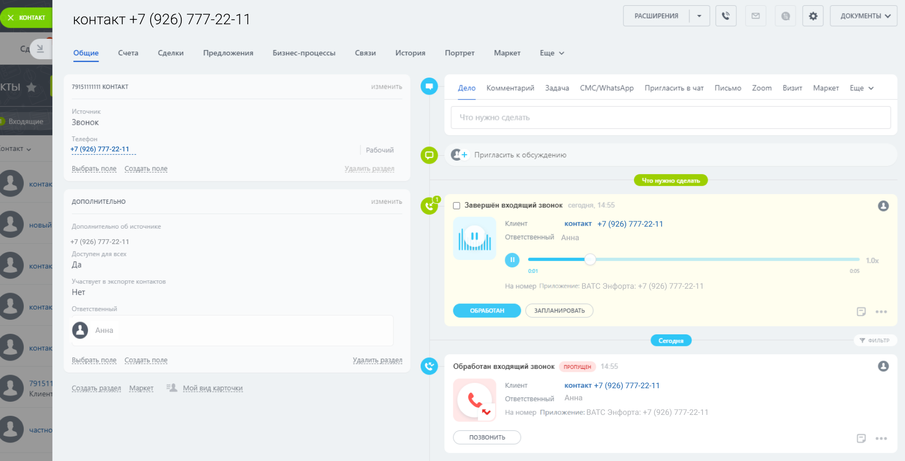 Ответив на звонок, сотрудник может сразу обратиться к клиенту по имени – это избавит позвонившего от необходимости представляться и пересказывать детали предыдущих этапов общения с вашей компанией. Кроме того, клиенту будет приятно, что его помнят, и это значительно повысит лояльность. Даже если вызов совершается с неизвестного номера, когда вы ответите на звонок, у вас будет возможность оставить комментарий, создать сделку и/или счет прямо во время разговора.