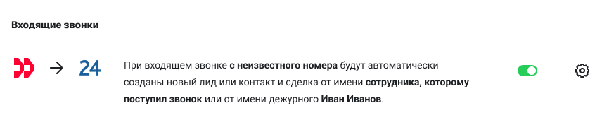 1. Чтобы при новом входящем или исходящем звонке в Битрикс24 автоматически создавался лид или сделка с контактом, нужно включить создание этих сущностей в АТС.