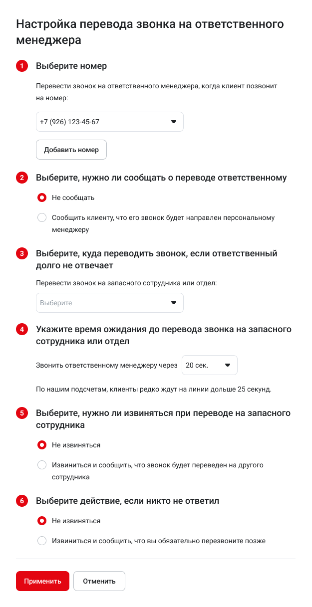 Звонки от клиентов могут автоматически перенаправляться на персональных менеджеров, если вы установите такое правило в настройках интеграции. Вы также можете указать, с кем соединить клиента, если персональный менеджер не ответит на звонок.