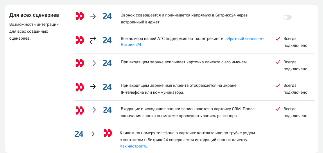 • чтобы управлять звонками прямо в интерфейсе Битрикс24, сдвиньте переключатель вправо в первом сценарии этого блока – «Звонок совершается и принимается напрямую из Битрикс24 через встроенный виджет». Подробнее о звонках через виджет Битрикс24 читайте в статье «Звонки из Битрикс24 (WebRTC)».