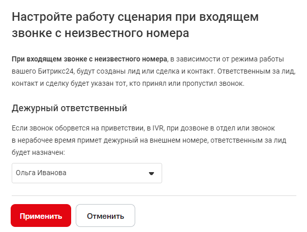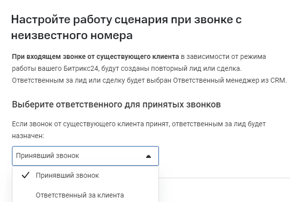 Например, если звонок поступил от существующего клиента, то ответственным за лид может быть назначен сотрудник, принявший звонок, либо ответственный за контакт.
