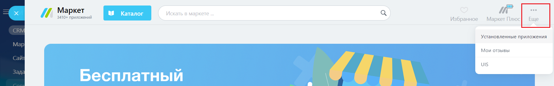 Авторизуйтесь в Битрикс24 и перейдите в раздел «Маркет». Найдите интеграцию с вашей АТС: либо нажмите на кнопку «Еще» – «Установленные приложения», либо введите название оператора в поисковую строку (например: MTC Exolve).