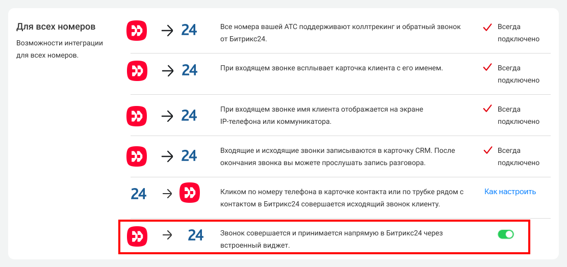 Готово! Теперь вы можете принимать и совершать звонки напрямую в Битрикс24 через встроенный виджет.