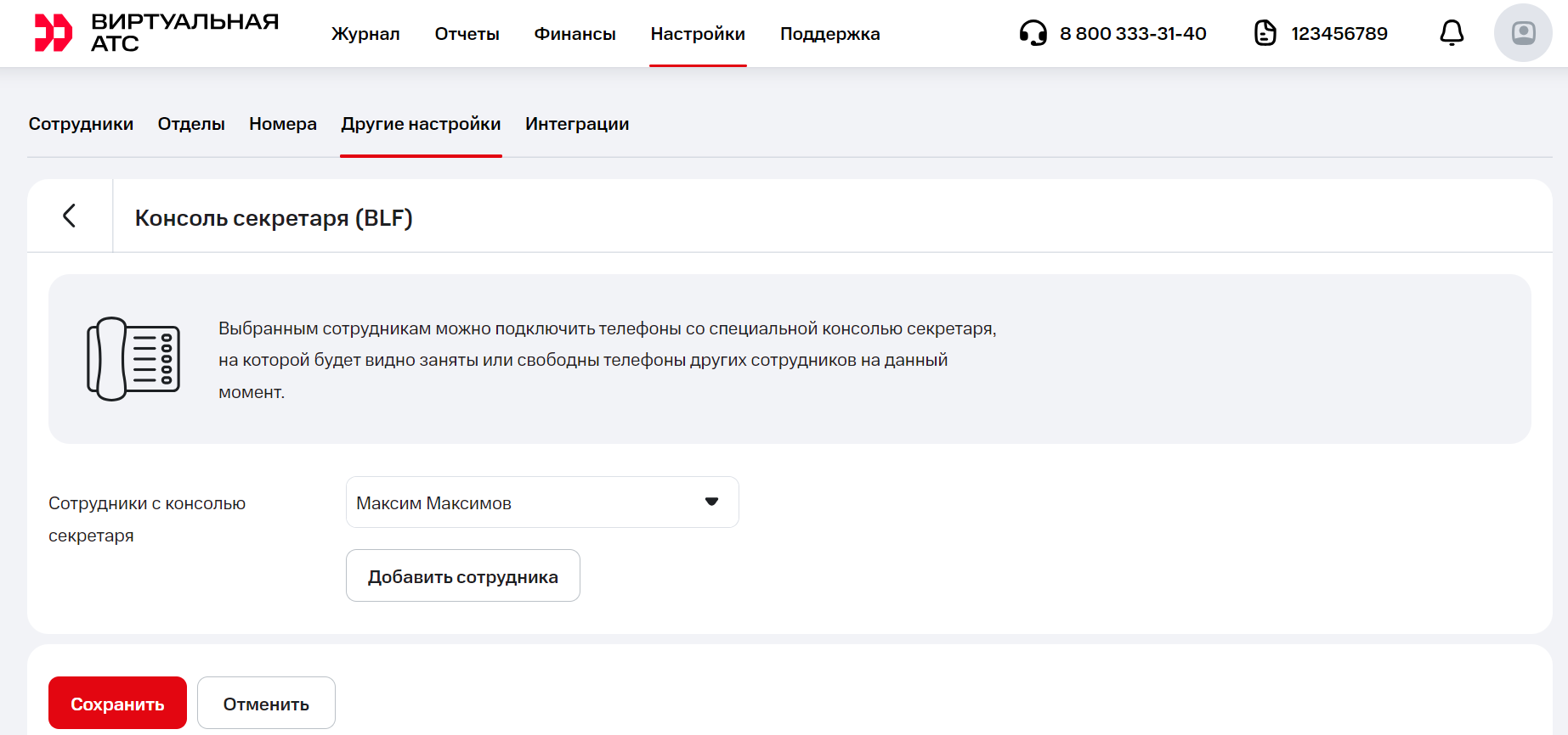 Сначала вам необходимо настроить SIP-аккаунт для консоли. Укажите сотрудника, который будет пользоваться консолью в разделе «Другие настройки» – «Консоль секретаря (BLF)».