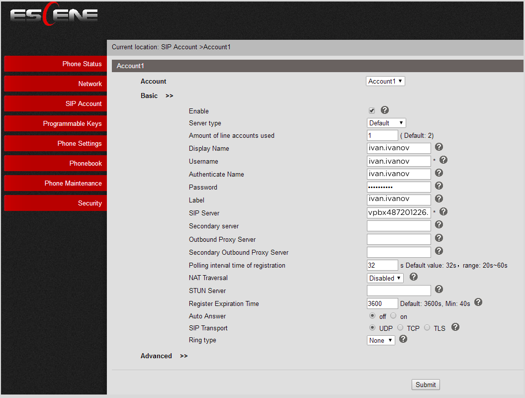 • В полях Display name, Username, Authenticate name и Label напишите логин без указание сервера