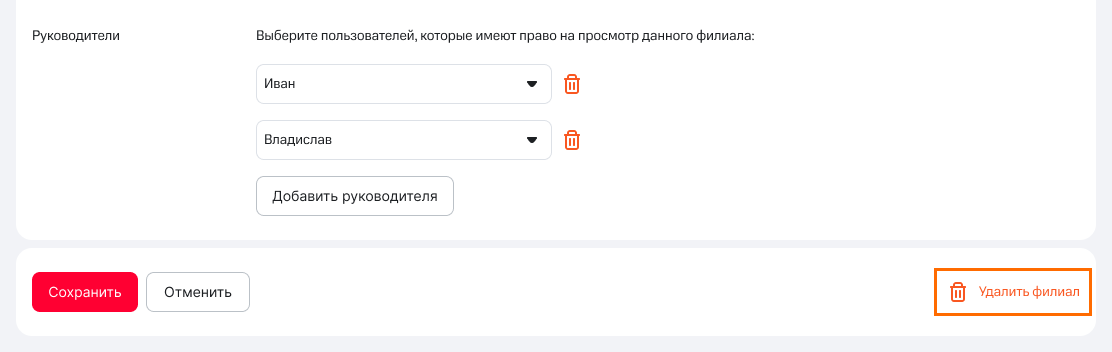 Если нужно будет удалить филиал, нажмите на корзину внизу той же страницы.