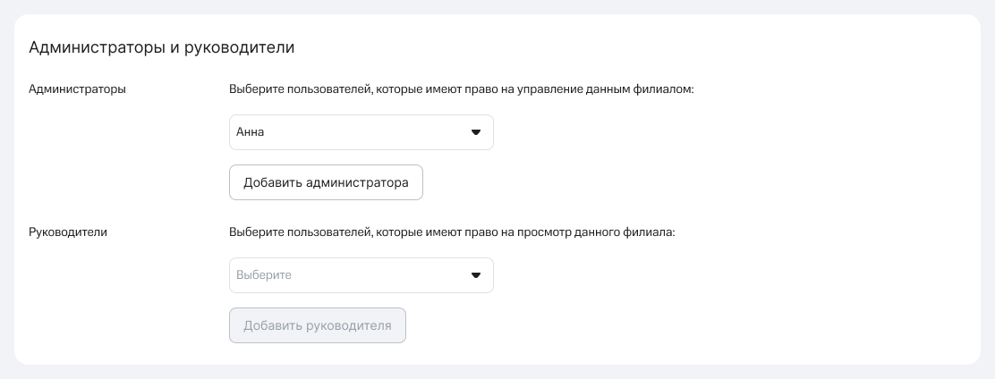 5. Настройте доступы к филиалу. Вы можете добавить новых администраторов и руководителей из сотрудников с логином АТС.