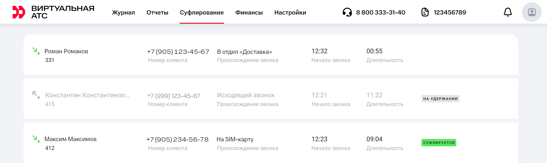 В ВАТС видны все активные звонки компании. Во вкладке «Суфлирование» по каждому вызову отображается время начала разговора и его длительность. Иконка наушников справа показывает, что к вызову можно подключиться. Также здесь отображается происхождение каждого звонка — исходящий он или входящий. Про входящие звонки можно узнать, куда именно позвонил клиент.