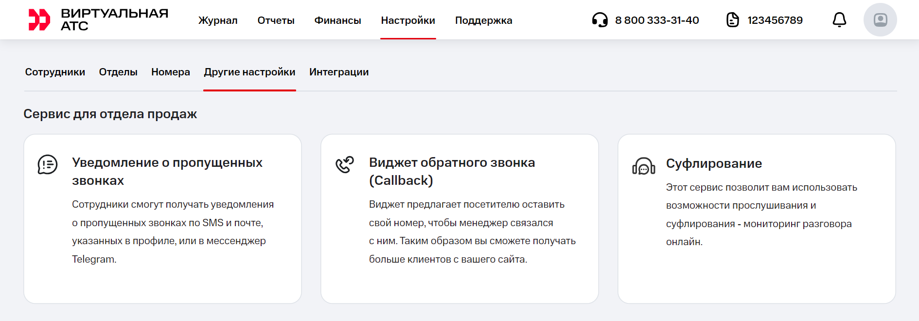 Чтобы получить доступ к функционалу онлайн-прослушивания и суфлирования подключите опцию «Эффективное обслуживание» в разделе «Финансы». Опция также включает в себя мониторинг очередей, оценку качества обслуживания, уведомление о номере в очереди.Далее в настройках АТС на вкладке «Другие настройки» найдите раздел «Сервис для отдела продаж» и нажмите на блок «Cуфлирование».