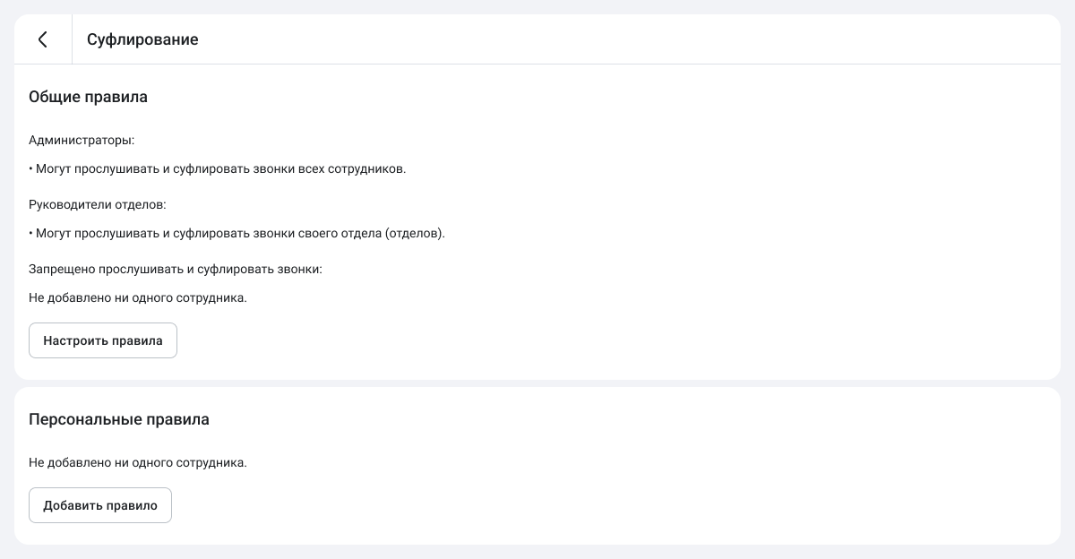 - В общих правилах настраивается доступ к прослушиванию и суфлированию звонков для администраторов и руководителей отделов, а также запрет на подключение к звонкам выбранных сотрудников.