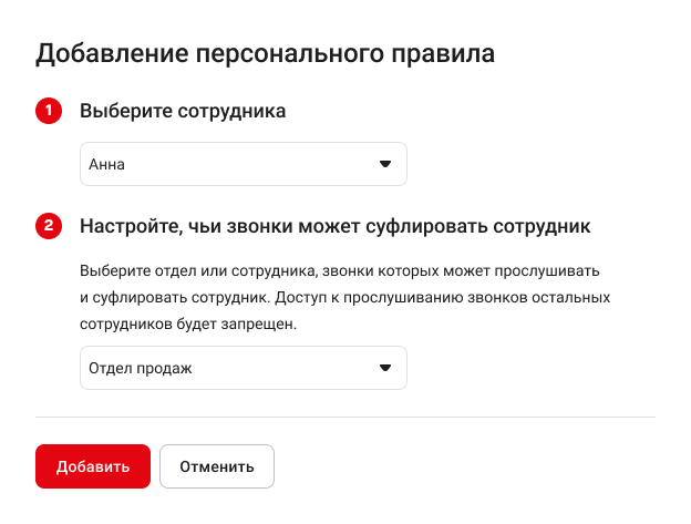 - В персональных правилах — доступ к прослушиванию и суфлированию звонков для конкретных сотрудников.