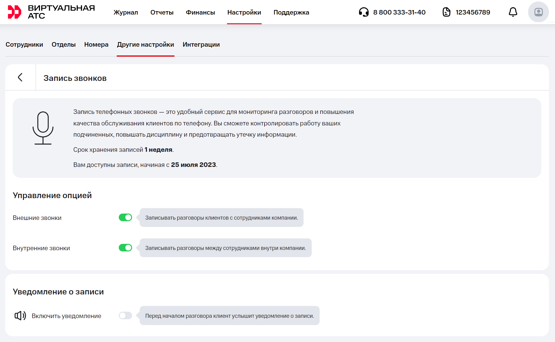 Чтобы воспользоваться услугой, необходимо подключить опцию «Запись звонков» в разделе «Финансы».
