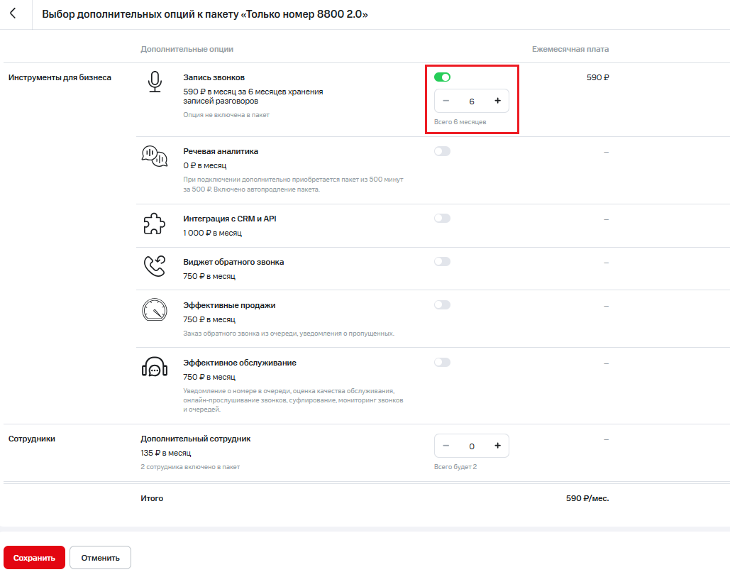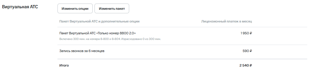 Стоимость опции отображается в столбце «Ежемесячная плата» в строке «Запись звонков». Сумма ежемесячного платежа за все подключенные опции — в строке «Итого».