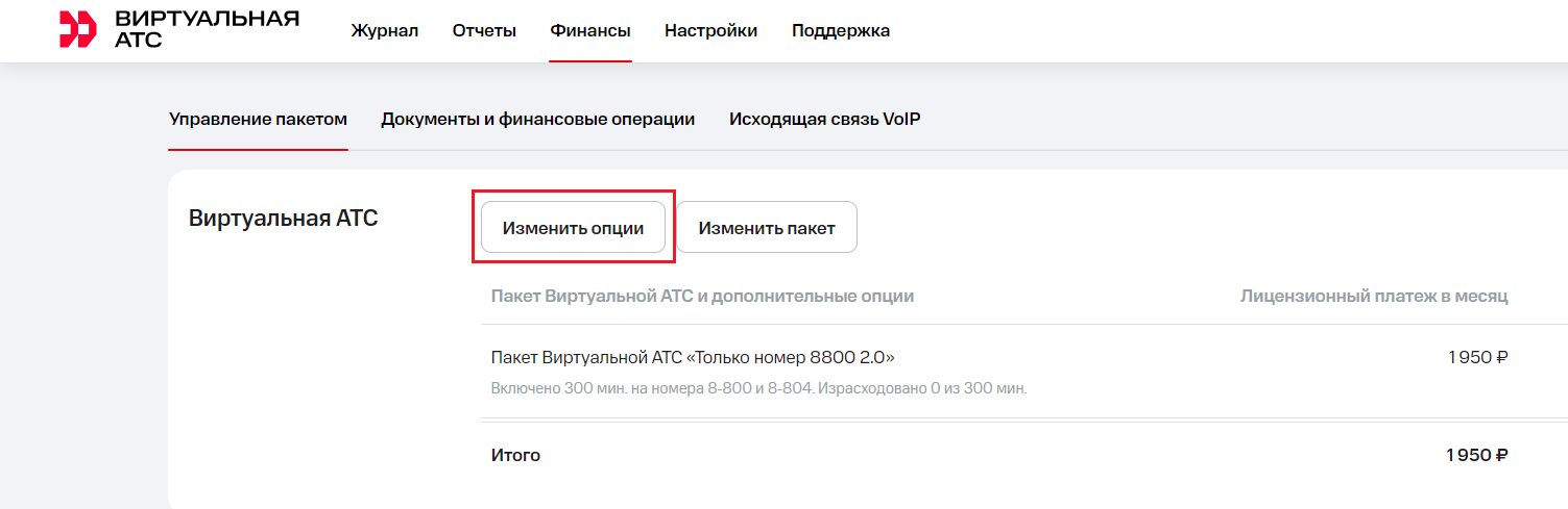 1. В личном кабинете перейдите в «Финансы» — «Управление пакетом» — «Виртуальная АТС» и нажмите на кнопку «Изменить опции». Откроется страница выбора опций для текущего пакета ВАТС Exolve.