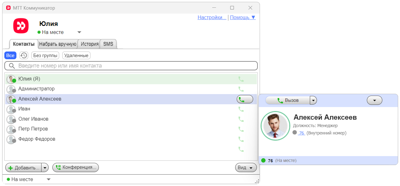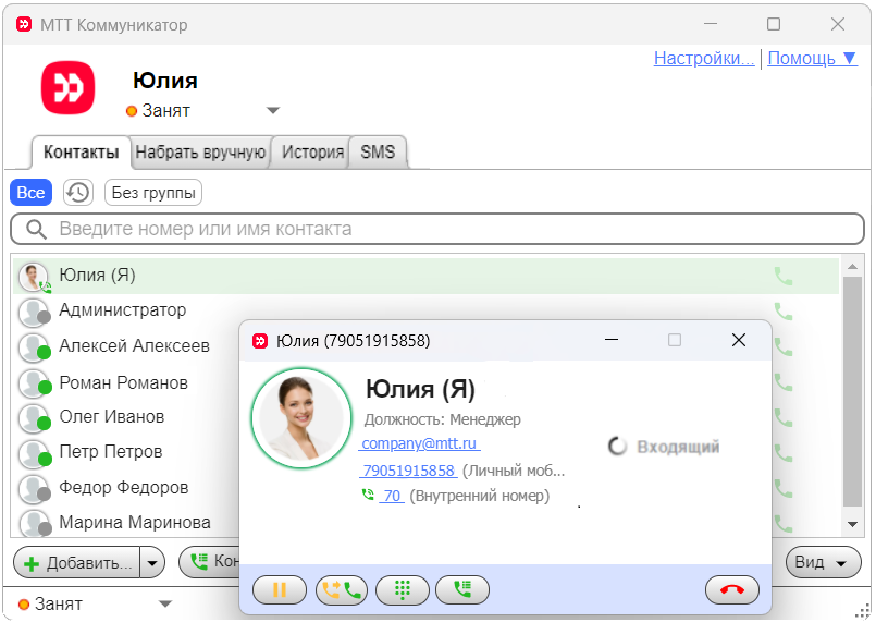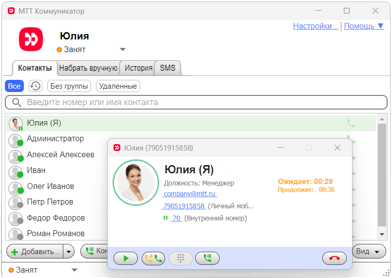 Виртуальная АТС передает в Коммуникатор список всех сотрудников. При наведении курсора мыши на имя конкретного сотрудника во всплывающем окне появится подробная информация о нем: должность, мобильный телефон и др. Любые изменения в учетных записях сразу автоматически отображаются в Коммуникаторе.