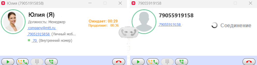 В окне разговора нажмите на иконку с двумя трубками, чтобы выбрать коллегу, на которого вы хотите перевести звонок, или введите номер вручную.