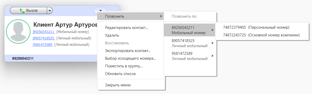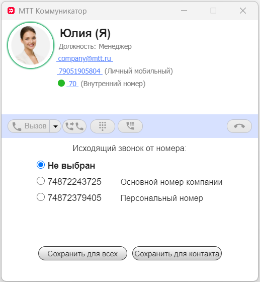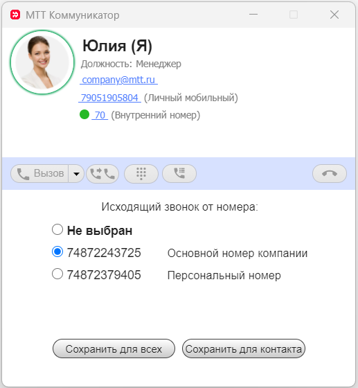 Выберите нужный исходящий номер. Если хотите совершить разовый звонок с выбранного номера — нажмите на кнопку «Вызов» в левом верхнем углу. Если хотите звонить клиенту с выбранного номера на постоянной основе, сначала нажмите «Сохранить для контакта».