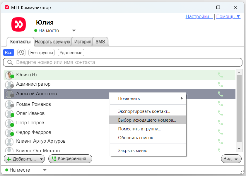 Если хотите сменить исходящий номер по умолчанию для отдельного клиента, кликните правой кнопкой мыши на нужный вам контакт, затем левой кнопкой — на «Выбор исходящего номера».