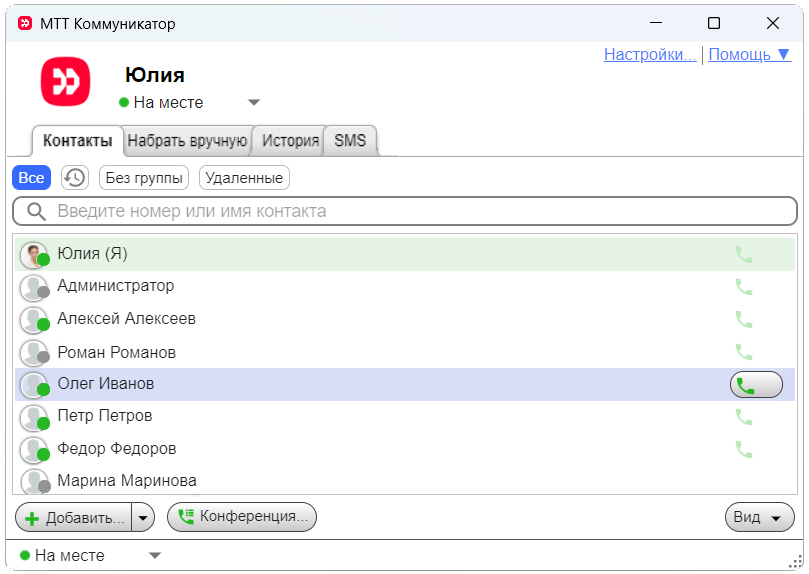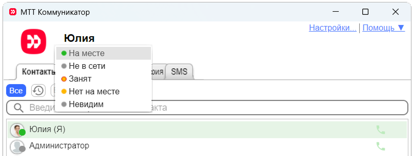На месте — ставится по умолчанию при авторизации в Коммуникаторе, если до этого не стояли статусы «Невидим», «Занят» или «Нет на месте». Все уведомления активны.