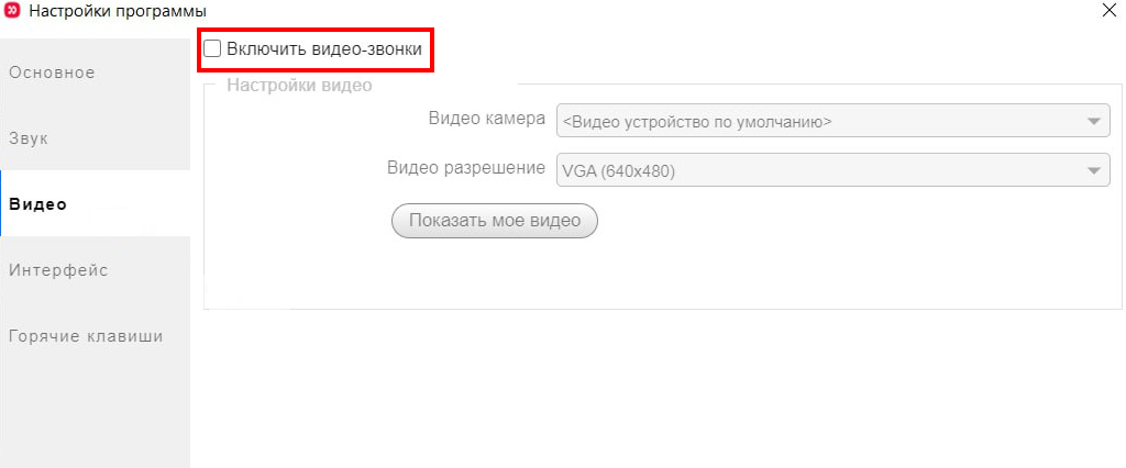 По умолчанию видео-звонки в Коммуникаторе выключены. Чтобы начать ими пользоваться, перейдите в настройки Коммуникатора – раздел «Видео» и поставьте галочку рядом с «Включить видео-звонки».