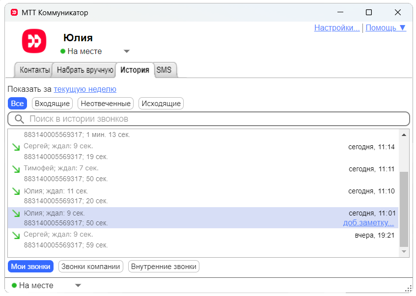 Чтобы посмотреть Историю звонков, не обязательно заходить в Виртуальную АТС. Все звонки сотрудника и компании доступны в Коммуникаторе на вкладке «История». Можно отфильтровать звонки по периоду и типу звонка, прослушать запись любого разговора и перезвонить прямо из Истории.
