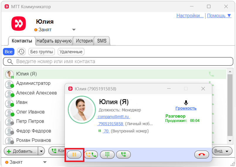 В это время ваш собеседник будет слушать музыку, а вы увидите в окне Коммуникатора время удержания. Чтобы вернуться к разговору, снимите звонок с паузы.