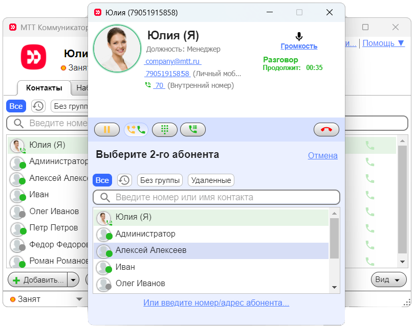 Если вам нужно собрать в одном звонке несколько коллег или клиентов, вы можете организовать аудиоконференцию и управлять ею прямо через Коммуникатор МТС Exolve.