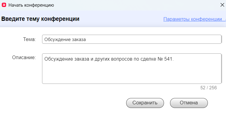 - либо кликните на фразу «Параметры конференции», в этом случае появится два дополнительных поля, в которых можно не только назвать событие, но и добавить описание.