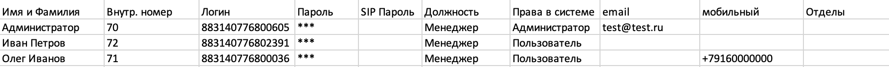 Если при загрузке сотрудник уже существует, то можно изменить его данные: пароль, короткий номер, должность, права, e-mail, номер для переадресации.