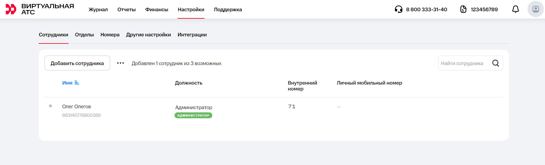 В личном кабинете ВАТС перейдите на вкладку «Настройки» – «Сотрудники» и нажмите кнопку «Добавить сотрудника».