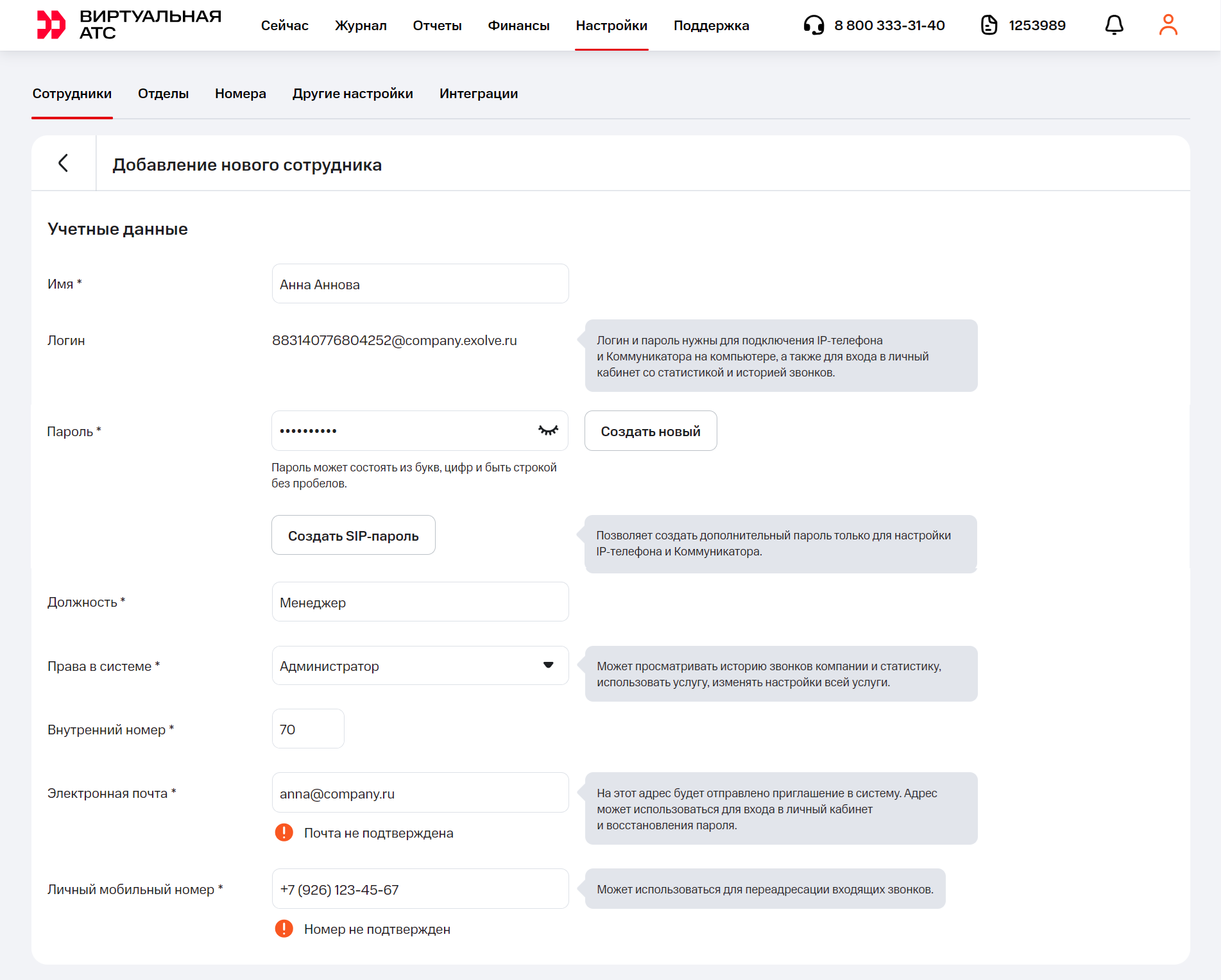 Обратите внимание: после того, как сотрудник с правами администратора подтвердит почту и личный мобильный номер, изменить эти данные в загружаемом списке будет нельзя. ВАТС будет предупреждать об ошибке. Если нужно изменить данные администратора, то это можно сделать только через личную карточку сотрудника.