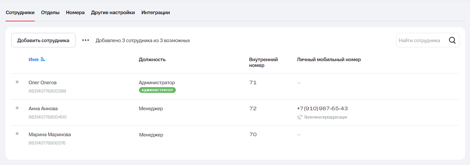 Сотрудники (рабочие места) – это аккаунты для ваших менеджеров, которые будут работать с Виртуальной АТС.