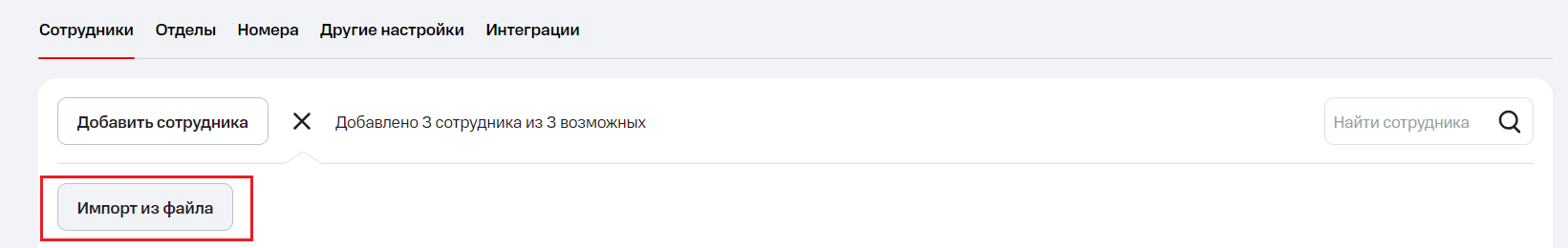 Если у вас много сотрудников, вы можете создать и редактировать их учетные записи через загрузку таблицы в Excel. Для этого правее кнопки «Добавить сотрудника» нажмите три точки и далее – «Импорт из файла».