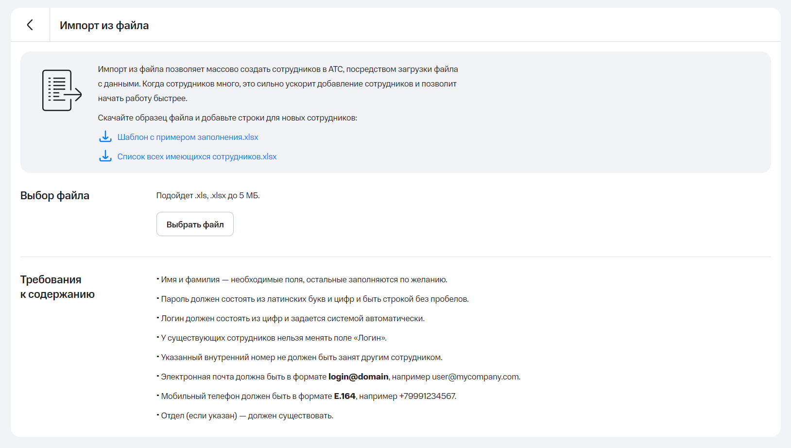 Здесь вы можете скачать шаблон файла для загрузки с нуля или файл с текущими сотрудниками.