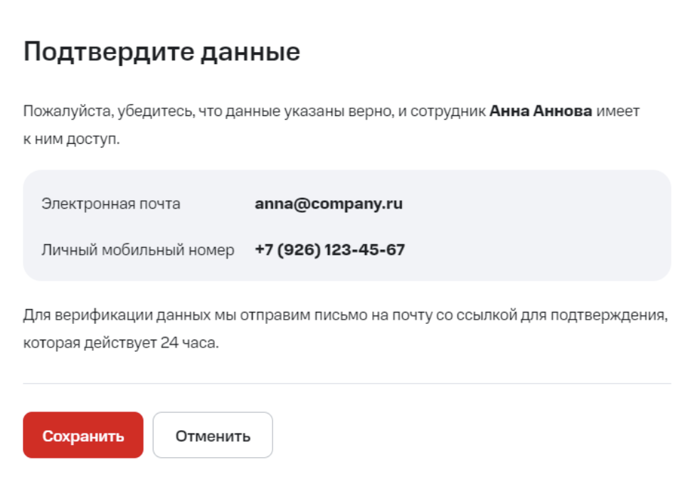 Обратите внимание: при создании учетной записи администратора ему необходимо подтвердить свою электронную почту и личный мобильный номер. При нажатии на кнопку «Сохранить» на странице «Добавление нового сотрудника» появится всплывающее окно. Проверьте контактные данные в этом окне – если все указано верно, то нажмите «Сохранить».