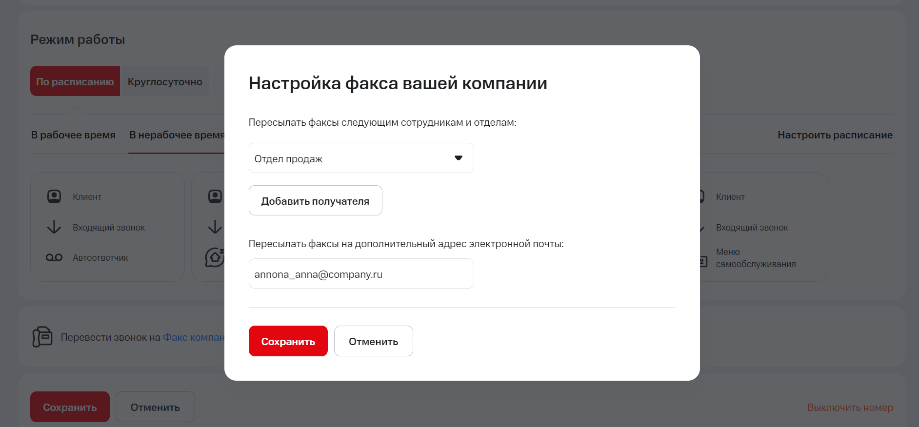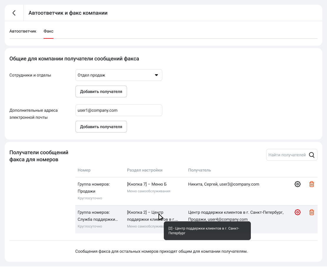 В этом разделе, помимо настроек общего факса компании, вы можете изменять получателей факса для выбранных номеров. Чтобы изменить настройки, кликните на шестеренку справа от выбранного номера. В открывшемся окне вы можете добавить или удалить получателей факса, а также указать дополнительные электронные адреса, куда будут отправляться факсы.